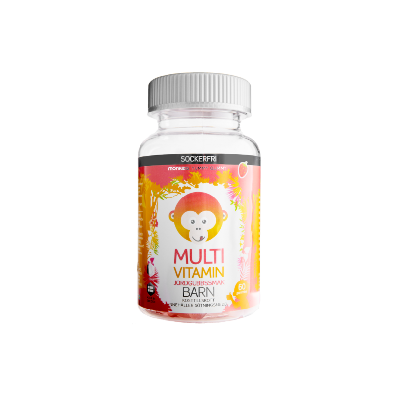 Monkids Multivitamin Sockerfri Barn Jordgubb är en svensktillverkad, sockerfri och vegansk gummy med 11 vitaminer. Produkten har högt innehåll av vitaminer – därför räcker det att ta en gummy om dagen. För att ditt barn ska vilja ta sina vitaminer är produkten otroligt god med naturlig jordgubbssmak, har en mjuk konsistens som barn gillar och är formad som en söt apa.