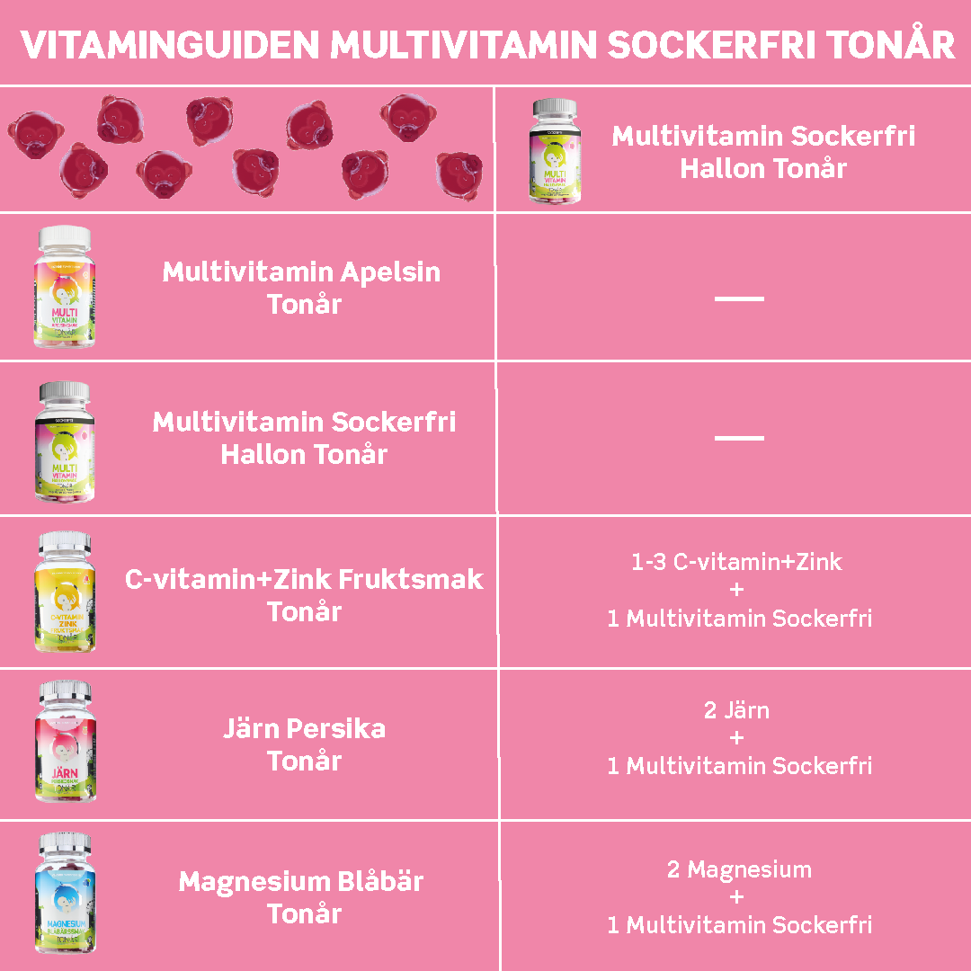 Ingredienser: Fyllnadsmedel (maltitolsirap), sötningsmedel (xylitol), majsstärkelse, vatten, vitamin-/mineralblandning (niacin (nikotinamid), vitamin E (DL-alfa-tokoferylacetat), zink (zinkcitrat), vitamin B6 (pyridoxinhydroklorid), vitamin A (retinylacetat), folsyra (pteroylmonoglutaminsyra), jod (kaliumjodid), biotin (D-biotin), selen (natriumselenat), vitamin D2 (ergokalciferol), vitamin B12 (metylkobalamin)), vitamin C (L-askorbinsyra), naturlig arom (hallon), surhetsreglerande medel (natriumcitrater), svartmorotskoncentrat, vegetabilisk olja (kokos, raps), ytbehandlingsmedel (karnaubavax).